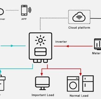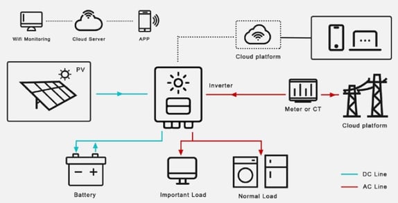 Inversores de diferentes capacidades que se conectan a tu red eléctrica + paneles solares + baterías + generador.